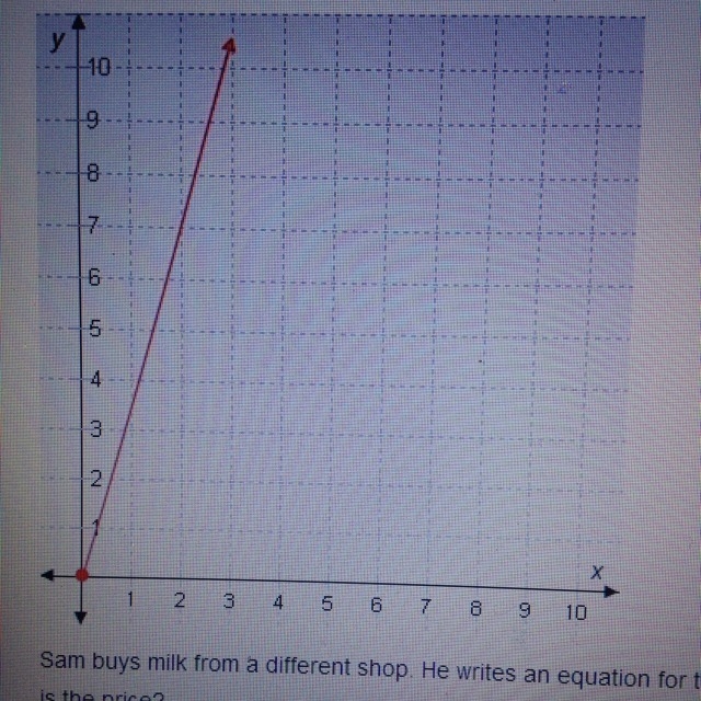 Sam buys milk from a shop. He writes an equation for the amount he spends on milk, p = 3.4g, where p is the cost and g is the gallons of milk bought. Who buys milk at a lower rate, and what is the price?