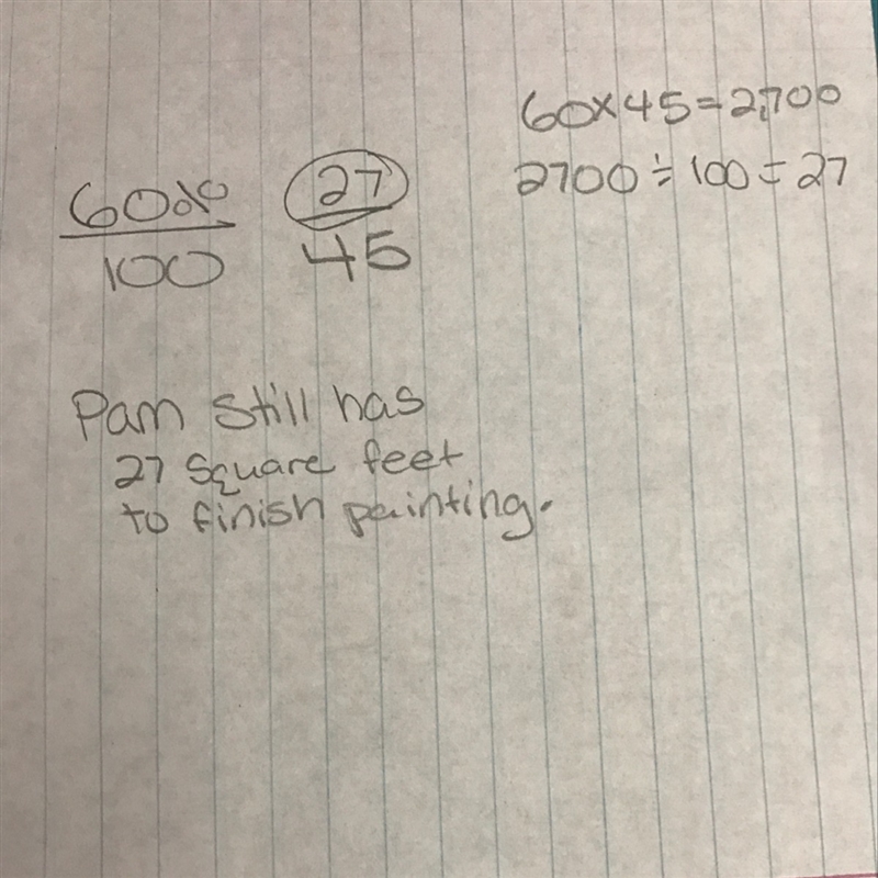 Pam is painting a total of 45 square feet in her bedroom. If she has painted 60% so-example-1