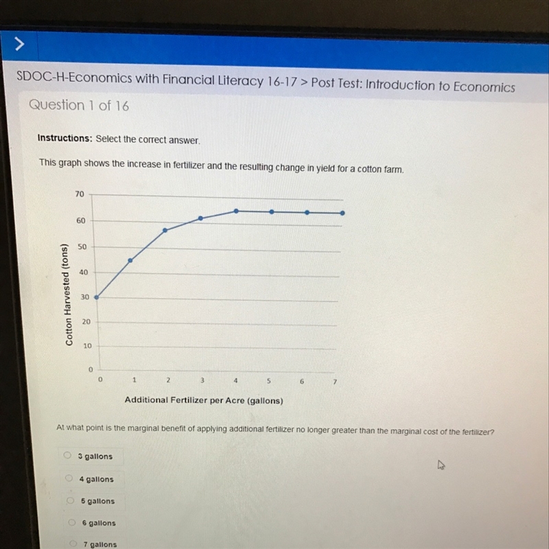 As can be seen in the graph, marginal benefit from additional fertilizers becomes constant beyond 4 gallons. Thus, it is beyond 4 gallons of fertilizers that marginal benefit of applying additional fertilizer is no longer greater than the marginal cost of the fertilizer.