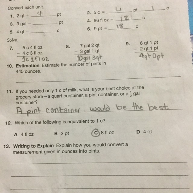 For 13 you do how many ounces go into a pint which you will need to explain using how many cups in a pint