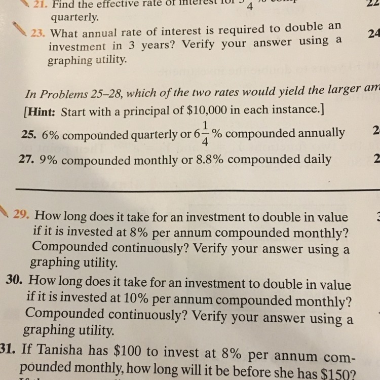 How long does it take for an investment to double in value if it is invested 8% per annum compounded monthly? Compounded continuously? It's number 29.