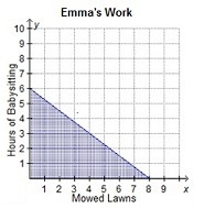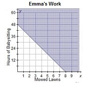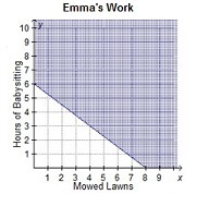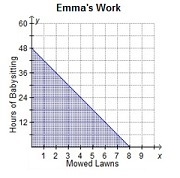 Emma earns $6 each time she mows the lawn and $8 per hour for babysitting. She is saving up to buy a new pair of jeans that cost $48. If she mows the lawn x times and babysits for y hours, which graph shows the amount of work she needs to complete to earn at least enough to purchase the new jeans?