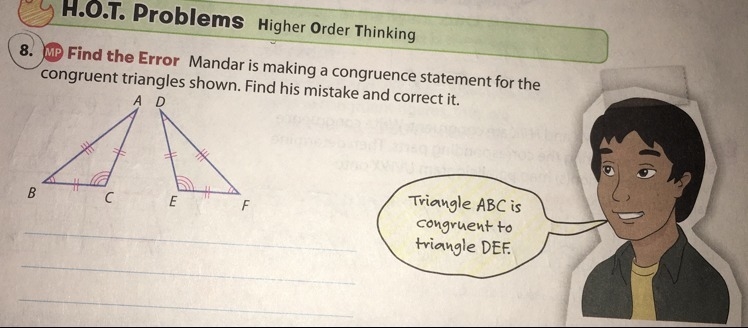 mandar is making a congruence statement for the congruent triangles shown find his mistake and correct it
