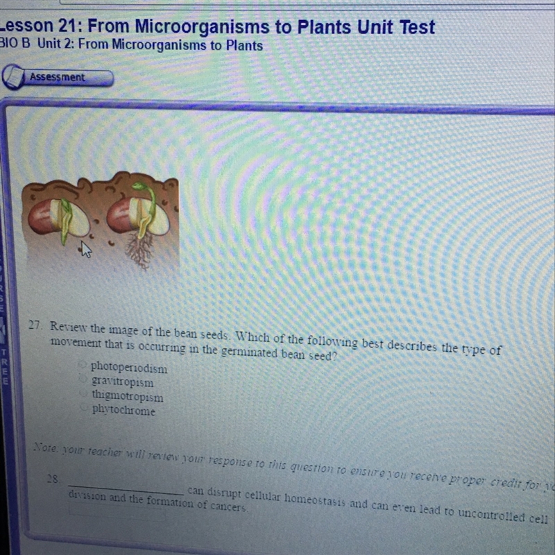 The answer is B, gravitropism. This is a bad question, but I know for a fact that it is gravitropism, and not because I took the same assessment not too long ago (Ahem), lol. I hope this helps!