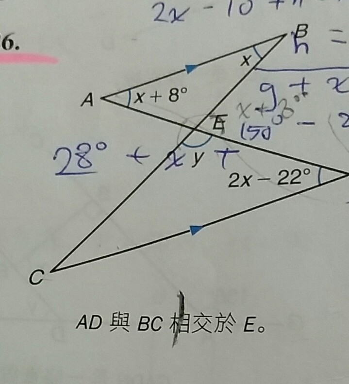 We know from the figure that angle B is x or now that we solved for x is 30 degrees. Also, we know that both angle A and angle D are 38 degrees. Now we can solve for the vertical angle E which has a measure of y degrees. A triangle has the sum of its angles equal to 180 degrees.