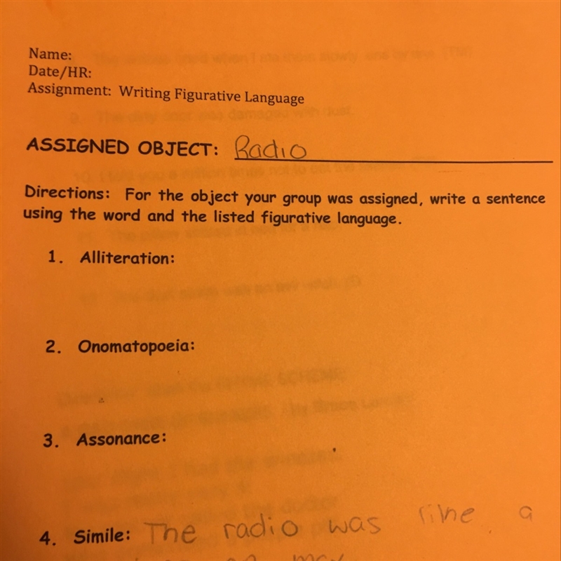 Just need to write an alliteration,onomatopoeia, and assonance with that word radio