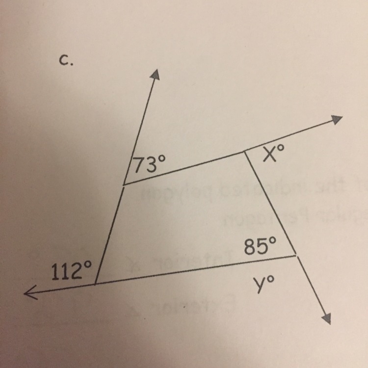 The angle to the right of the one that equals 112 is 68 because they're supplementary. The one under 73 is 107 because they're supplementary as well. The angle under 85 is 95, because once again, they're supplementary. A quadrilateral is 360 degrees no matter what. Add 68+85+107. Take the answer and subtract that from 360 to get the final angle of your quadrilateral. Then subtract that number from 180 to get x