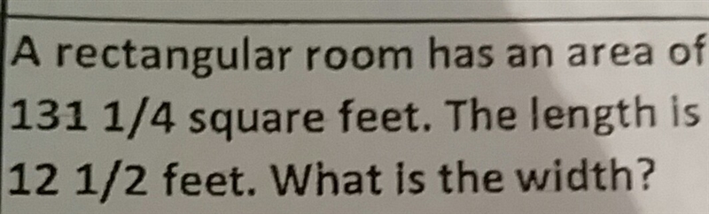 A rectangular room has an area of 131 1/4 square feet. the length is 12 1/2feet what is rhe width