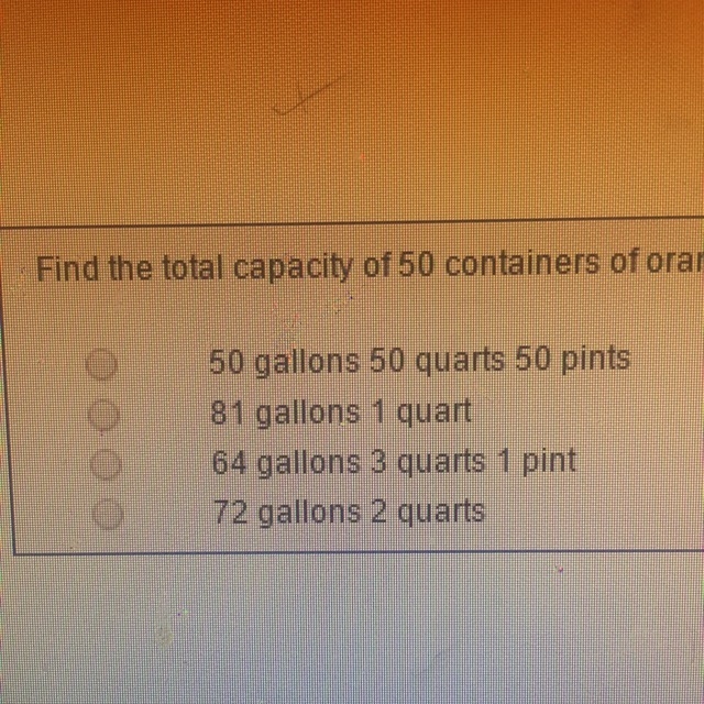 Find the total capacity of 50 containers of orange juice if each container holds 1 gallon 2 quarts 1 pint. a) 50 gallons 50 quarts 50 pints b) 81 gallons 1 quart c) 64 gallons 3 quarts 1 pint d) 72 gallons