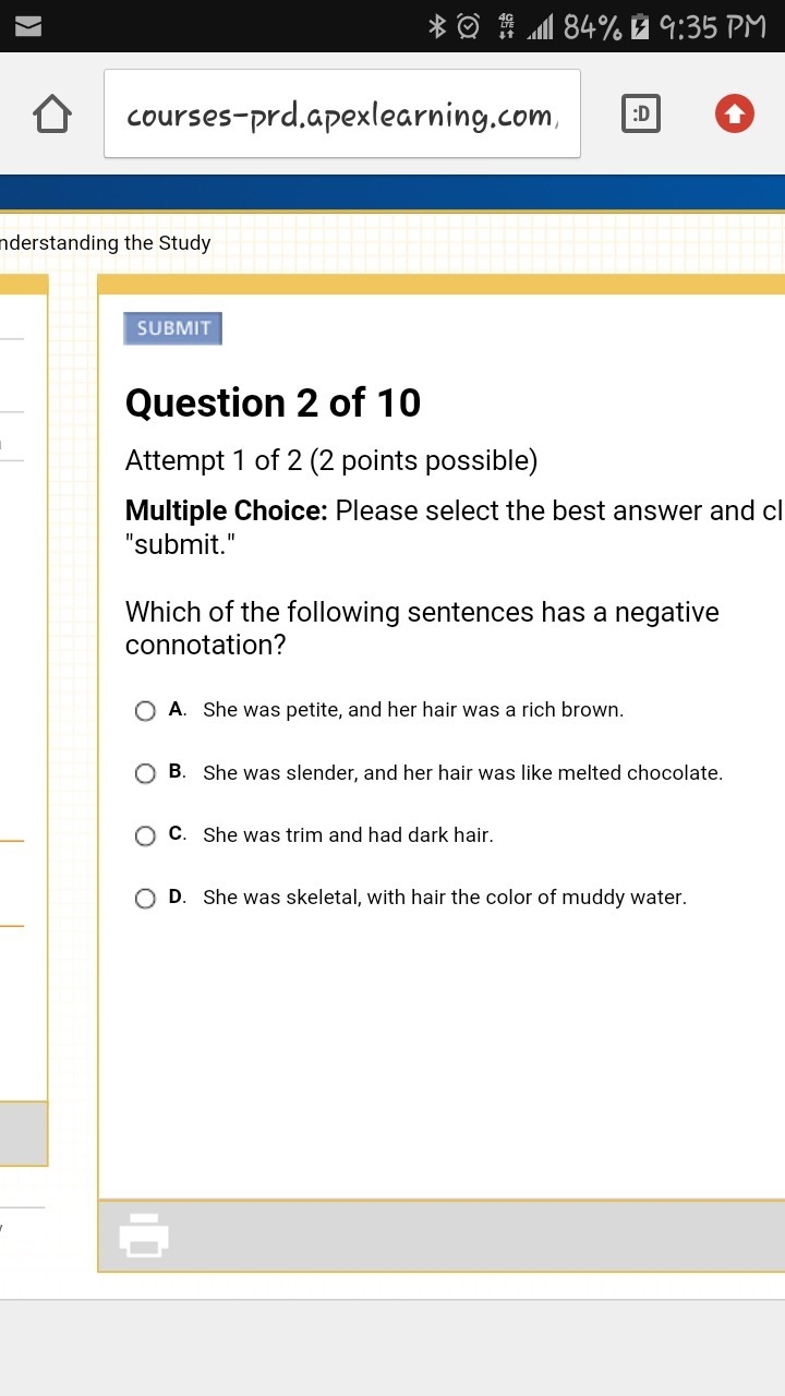 A, B, and C are all sentences with positive connotation. They describe favorable/desirable traits. Muddy water and skeletal are not positive phrases.