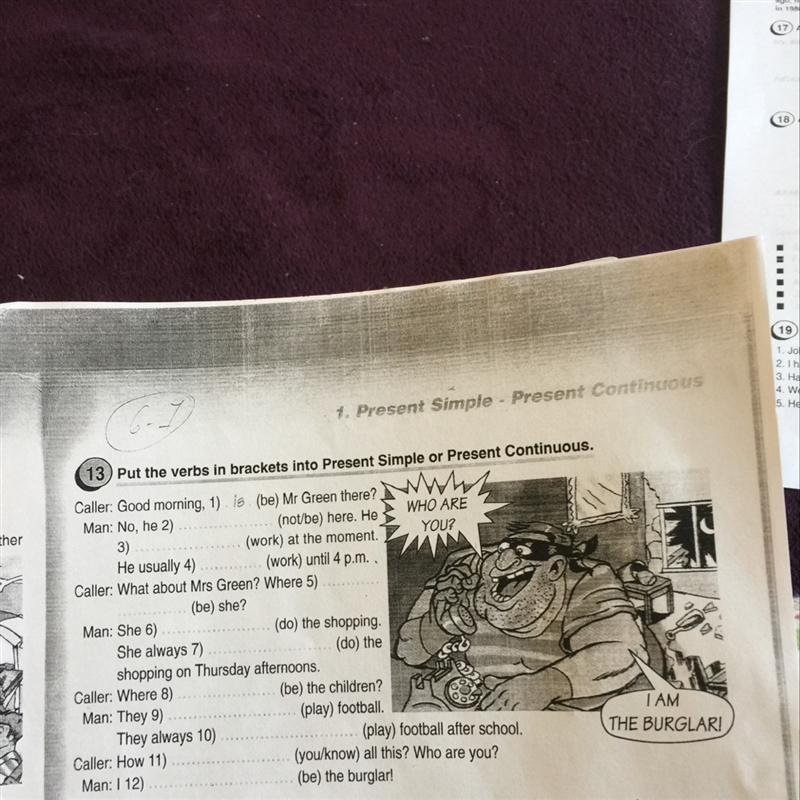 No, he IS NOT here. He IS at work at the moment. He usually WORKS until 4 p.m.