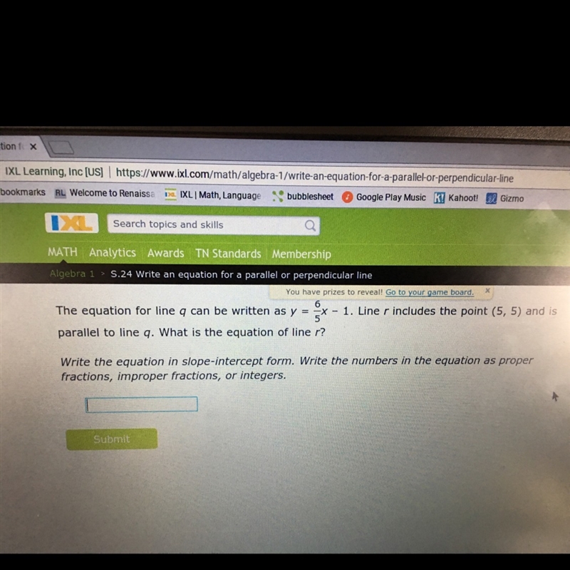 the line through point (5,5) : 5= (6/5)(5)+b ...b=-1