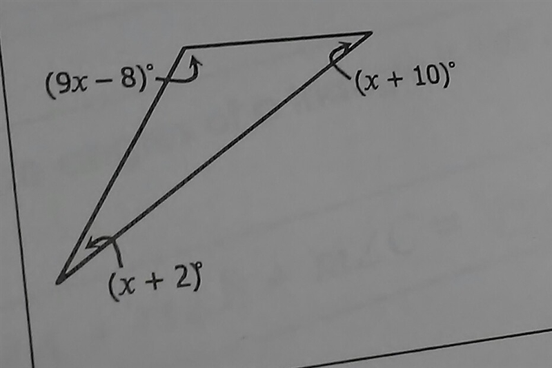 The rule for angles in a triangle is that they all need to add up to 180°, so you can make the three expressions equal 180 and solve: