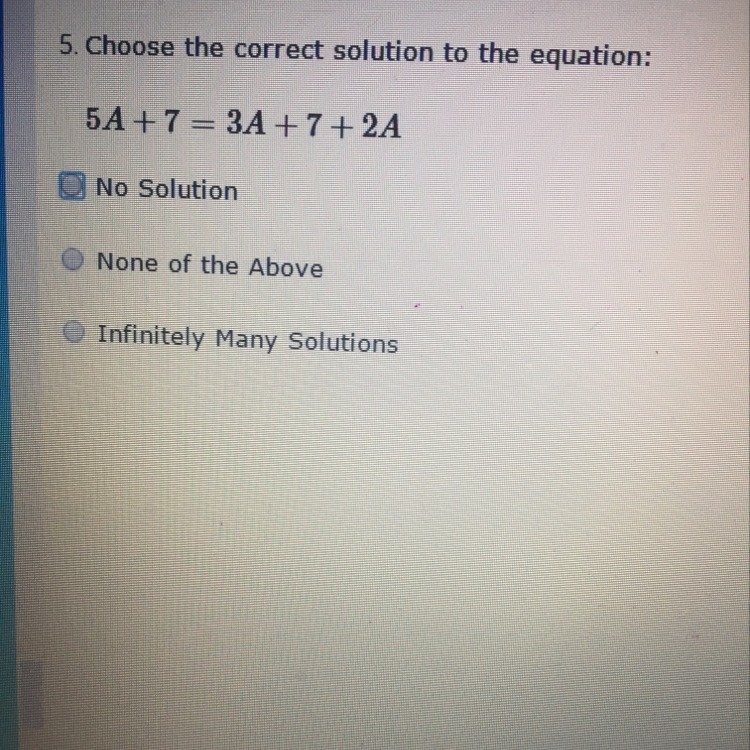 5A + 7 is always equal to 5A + 7 because it's the same equation. So the equation got infinitely many solutions.