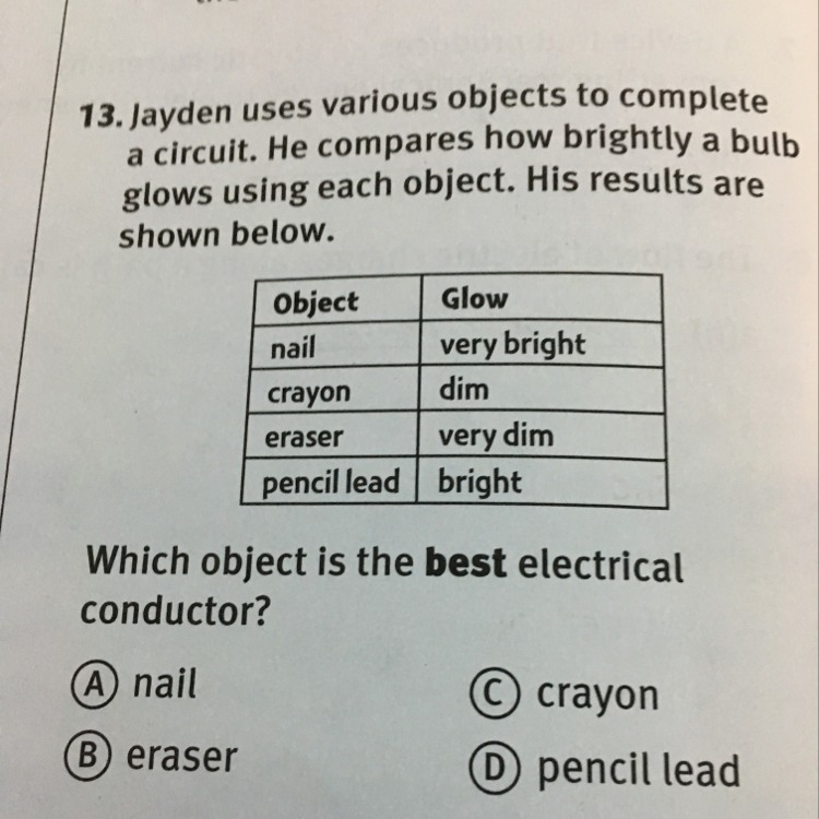 the best conductor is the nail it made the light bulb light up the brightest which means it had a lot more electricity flowing through it than any other