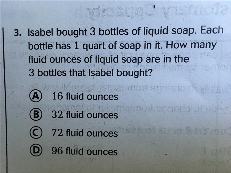 Isabel bought 3 bottles of liquid soap. Each bottle has 1 quart of soap in it. How many fluid ounces of liquid soap are in the 3 bottles Isabel bought?