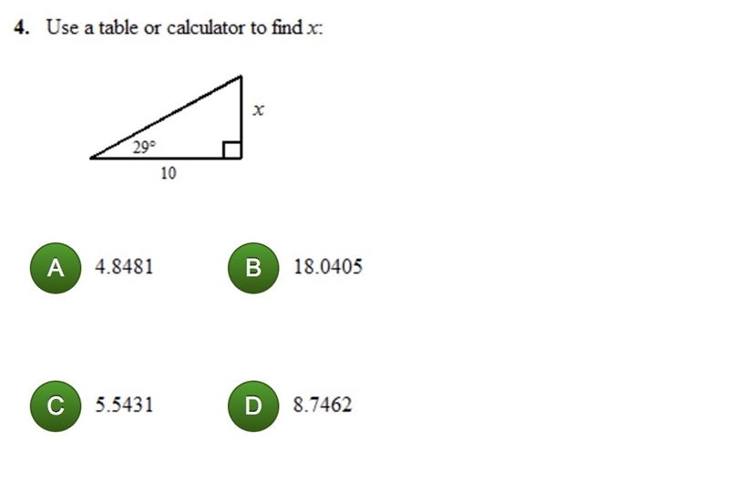 Let our angle θ (theta) = 29 degrees. The opposite side to our angle is x and the side adjacent to our angle is 10. Therefore, our formula is: