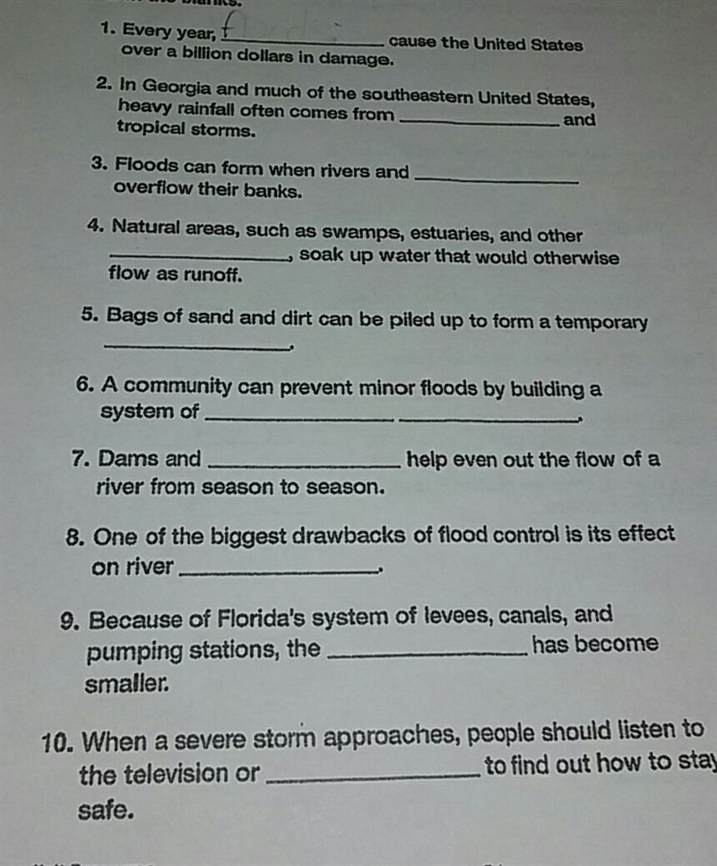 #1 is definitely floods. I think for #3 it might be streams or dams. For number 5 bags of sand and dirt can be used for temporary dams. I think for #4 the answer would be wetlands. For number 6 communities can help by building a system of dams and leevees. For #10 I think that people should listen to the TV or a radio. So Radio might be the answer. Hope I helped!