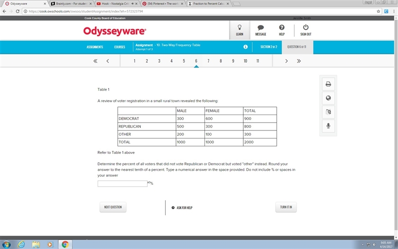 help im stuck pls -- Refer to the table above. Determine the percent of all voters that did not vote Republican or Democrat but voted "other" instead. Round your answer to the nearest tenth of a percent.