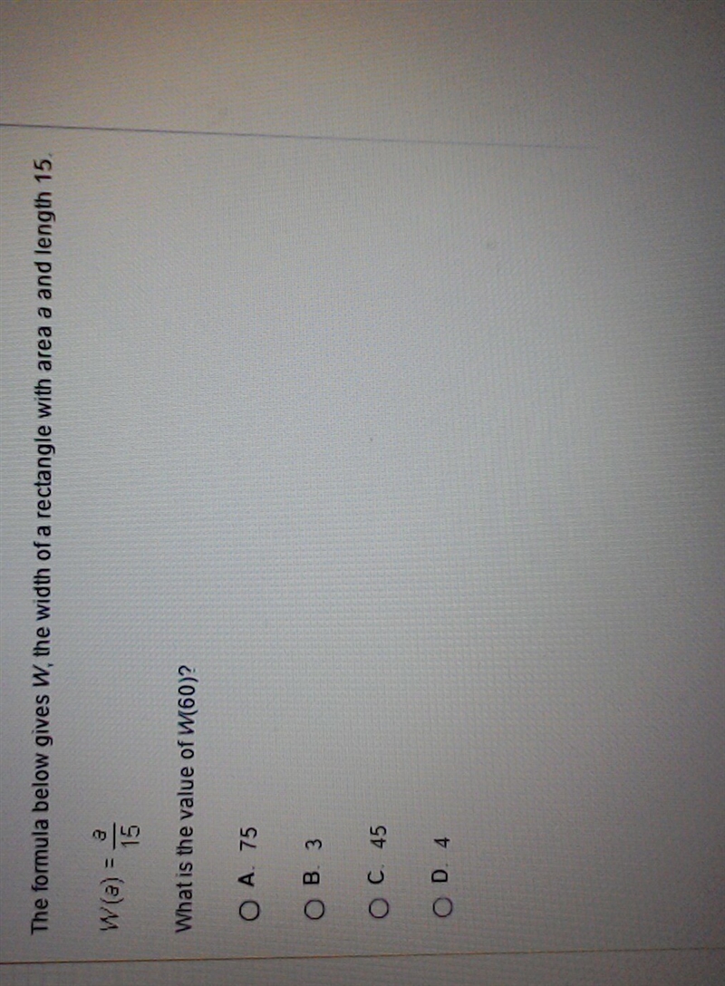 The formula gives W, the width of a rectangle with area A and the length 15. W(a)=a/15 What is the value of W(60)?