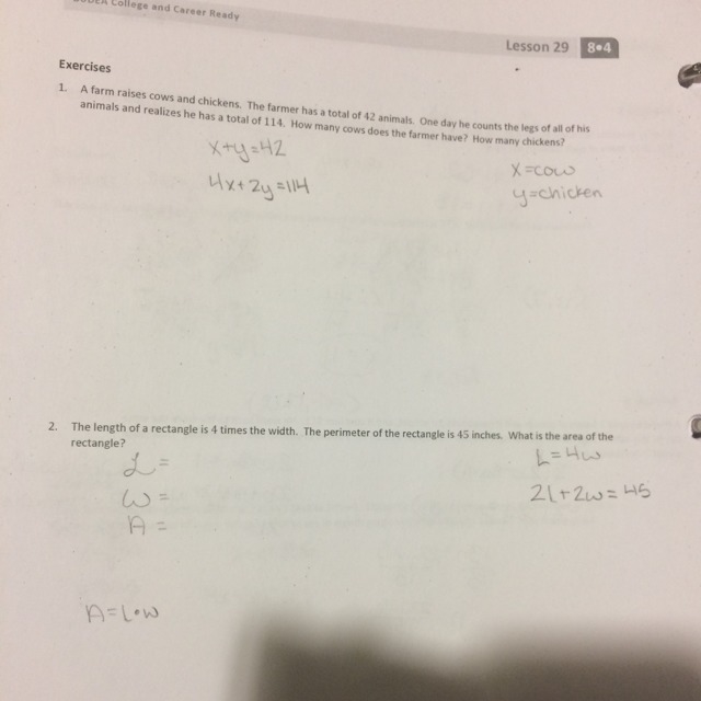 That is, whenever we see L in the second equation, we can substitute in 4W, instead, and work out what W is. After that, use the first equation and divide by 4 to find L.