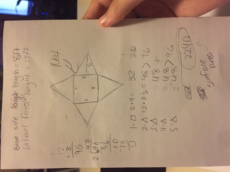 I turned the square pyramid into its net, found the area of each lateral face and the base, added them all up and I got 224 squared feet as the surface area.
