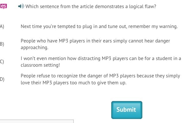 It's, "B", as you can not have MP3 Players in your ears, only the headphones that are with it, it is a logical flaw.