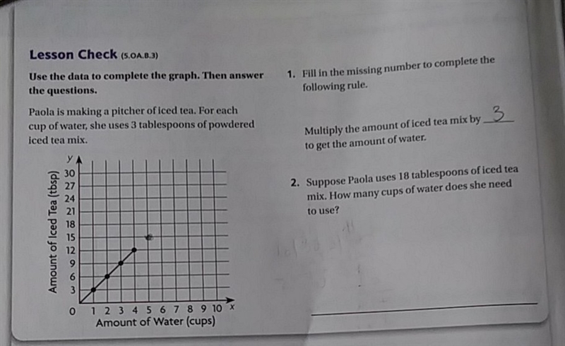 Paola is making a pitcher of iced tea. for each cup of water she uses 3 tbs of powdered mix. suppose Paola uses 18 tbs of iced tea mix. how many cups of water does she need?