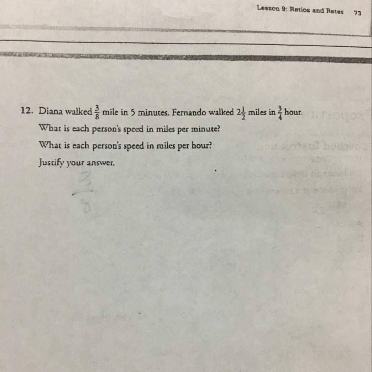 Diana: (3/8)/5=3/(5*8)=3/40 mi/s=0.075 mi/s