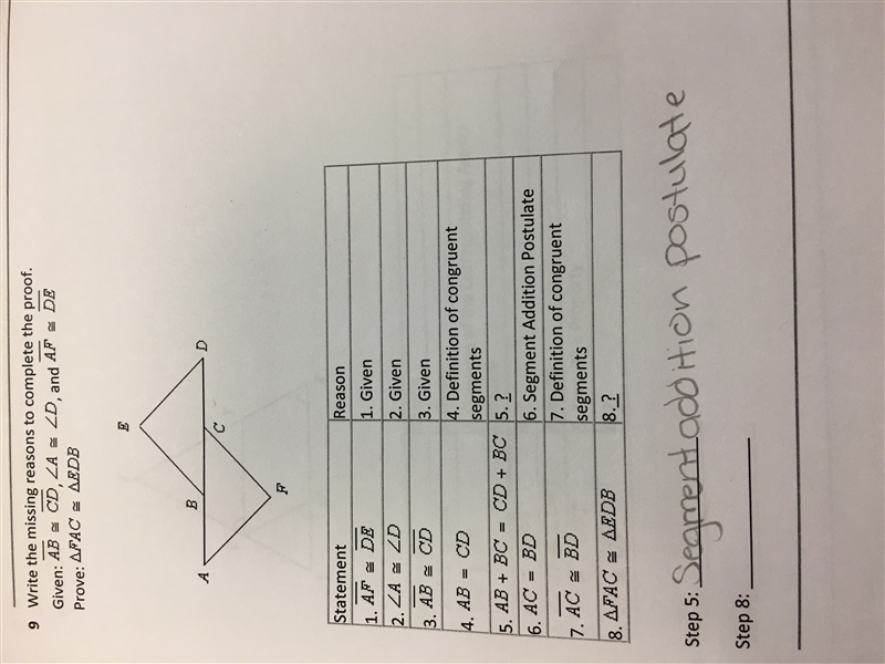 Given AB is congruent CD, angle A is congruent to angle D and A F is congruent to DE prove shape FAC is congruent to shape EDB