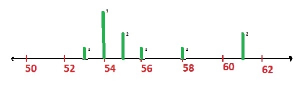3) Mark the points given to be plotted as as many times a point repeats, number it. Ex- 54 is repeated thrice, so we write above 54 in the line plot.