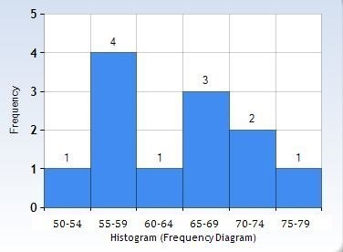 The heights are below:67, 63, 69, 72, 77, 74, 62, 73, 64, 71, 78, 67, 61, 74, 79, 57, 66, 63, 62, 71 ,73, 68, 64, 67, 56, 76, 62, 74.Create a histogram that correctly represents the data.