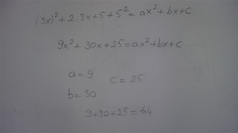If (3x+5)^2=ax^(2)+bx+c, what is the value of a+b+c?