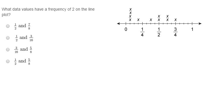 What data values have a frequency of 2 on the line plot? 1/2 and 7/8 1/2 and 3/16 3/16 and 5/8
