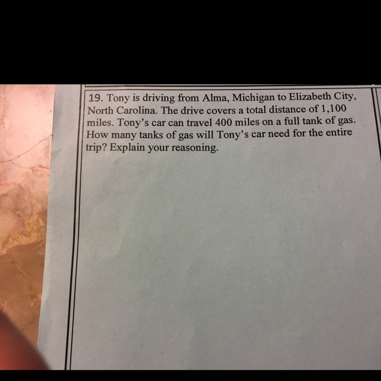 Tony is driving from alma ,Michigan to Elizabeth city, North Carolina . The drive covers a total distance of 1,100 miles. Tony car can travel 400 miles on a full tank of gas.how many tanks of gas will tony car need for the entire trip?explain ur reasoning?