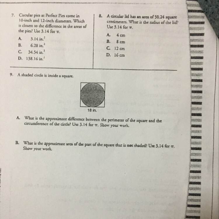 9a) Perimeter of square is 4*18 = 72. Perimeter of circle is 2*pi*r. r=9in