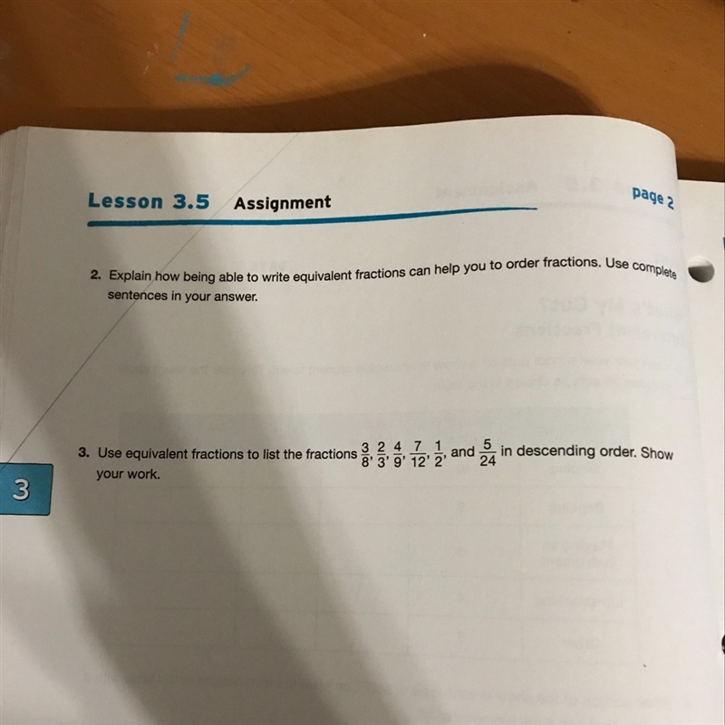 On #3 all of those fractions can be changed so that the denominator is 24. Take 3/8. 8 is a factor of 24, and if you multiply 8 by 3 you will get 24. Then you need to multiply the numerator by 3 and you should get 9. now you have 9/24. do that with the rest of the fractions and then you can list them. Another was to do this is the butterfly method. Compare each of them until you are able to compare them all. This method is very time consuming but it works too. You could also just estimate but it isn't always the most accurate way of listing fractions. Hope this helped! :)