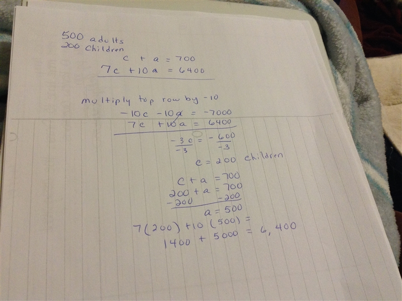 Instructions:type the correct answer in each box.the admission fee for a charity event is $7 for children and $10 for adults. the event was attended by 700 people, and the total amount collected in admissions was $6,400.there were ___children and ___ adults at the show.
