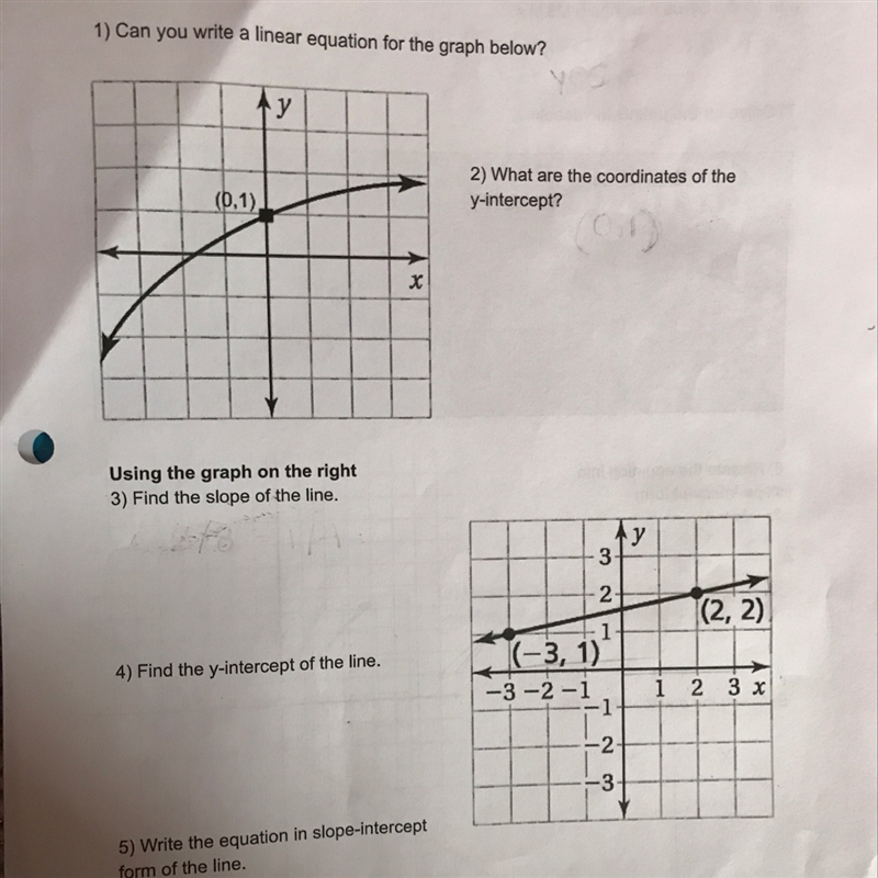 1) This is not a linear equation as it curves and thus has acceleration and thus its velocity is not constant. You COULD find a linear least squares equation, but I do not think that that is what they want you to do, and the least squares regression is still only an approximation...so I would say that you cannot write a linear equation for the graph.