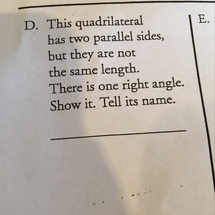 A trapezoid, which is basically a quadrilateral with two parallel sides? Sorry if I'm wrong but I'm hundred precent sure.