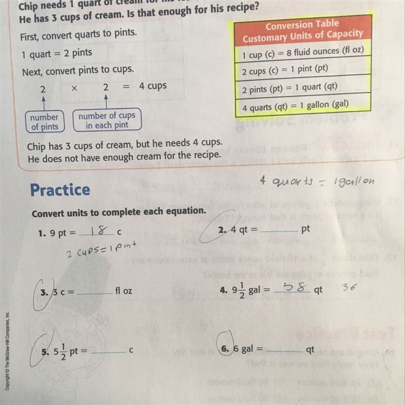 6. 24; Since there are 4 quarts in each gallon, then 6 x 4 = 24, so 24 quarts.