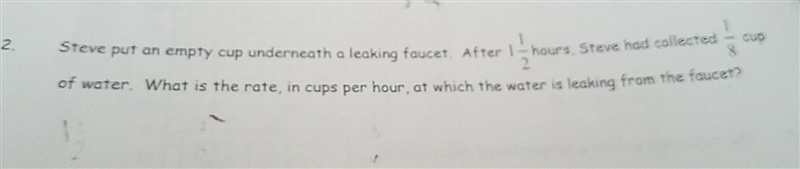 Steve put an empty cup undern eath a leaking faucet After l and a half hours,Steve had collected 1 out of 8 cup of water , . What is the rate, in cups per hour, at which the wat…