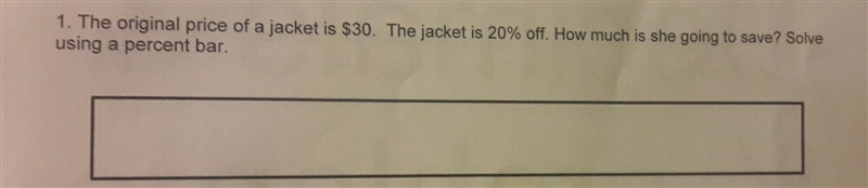 1. The original price of a jacket is $30. The jacket is 20% off. How much is she going to save? Solve Using a percent bar.