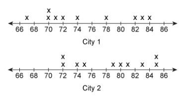 We can notice from the spread in the temperatures of the two given cities that, the high temperature points are more in city 2 than in city 1.