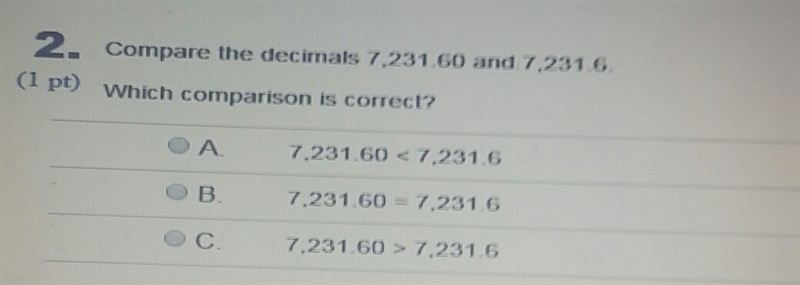 Compare the decimnals 7,231 60 and 7,231 6. C1 pt) Which comparison is correct? A. 7,231.60 7,231 6 7,231.60 e 7.231 6 7,231. 60 7,231. 6