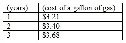 James researched gas prices for the last 3 years (as shown in the table below). Based on your line of best fit, what will be the price of gas 50 years from now? (Hint: year 53)