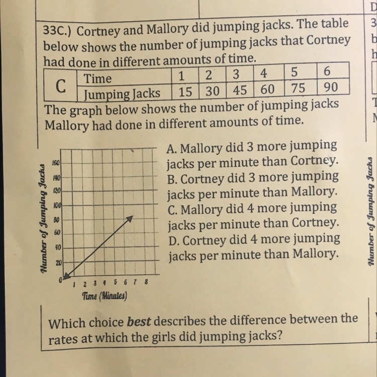 D. Cortney did 4 more jumping jacks per minute than Mallory.
