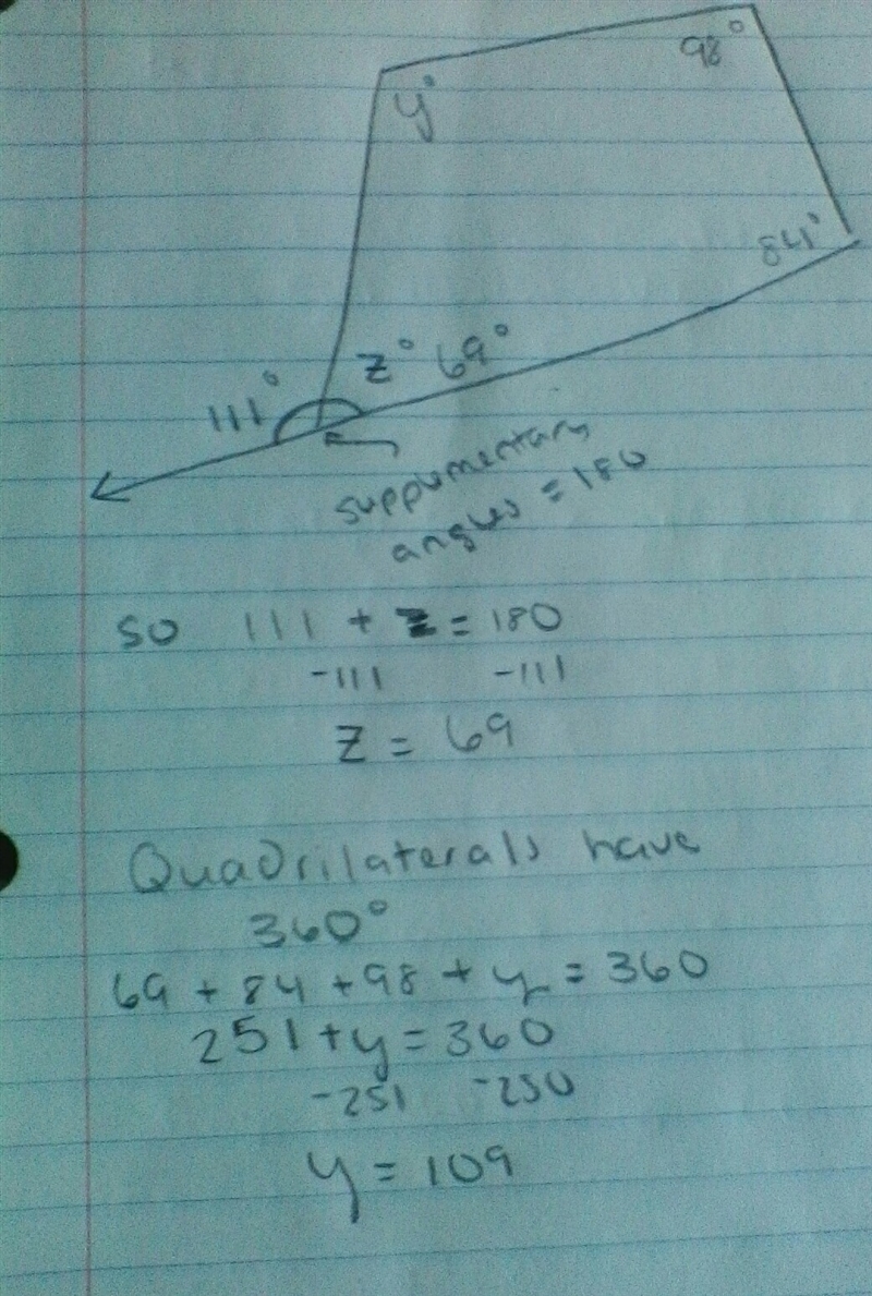 Work shown above! z = 69 degrees y = 109