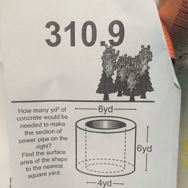 The way I am seeing this is that you have to take the surface area of the whole cylinder (the one with the diameter of 6) and subtract from it the surface area of the inner cylinder (the one with the diameter of 4) in order to get how much concrete you need to get that "outer shell" of concrete.