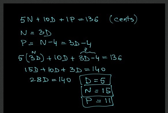 Lucy pays $1.36 for fruit using dimes nickels and pennies she pays with three times as many nickels as dimes and the number of pennies is four less than the number of nickels ho…